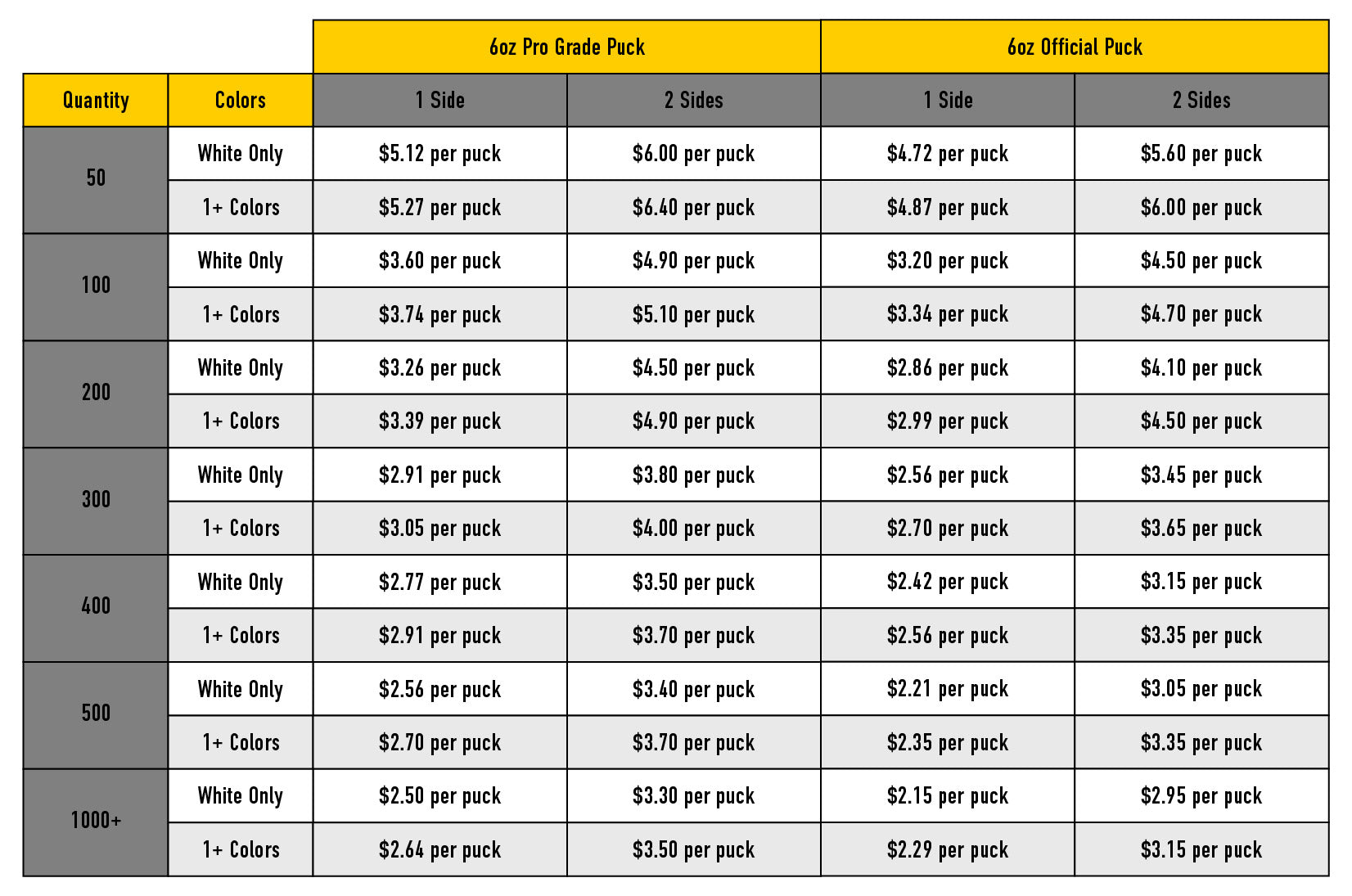 If the artwork needs modifications, adjustments, or formatting, a small artwork fee will apply. Contact us at pucks@howieshockeytape.com for a quote.